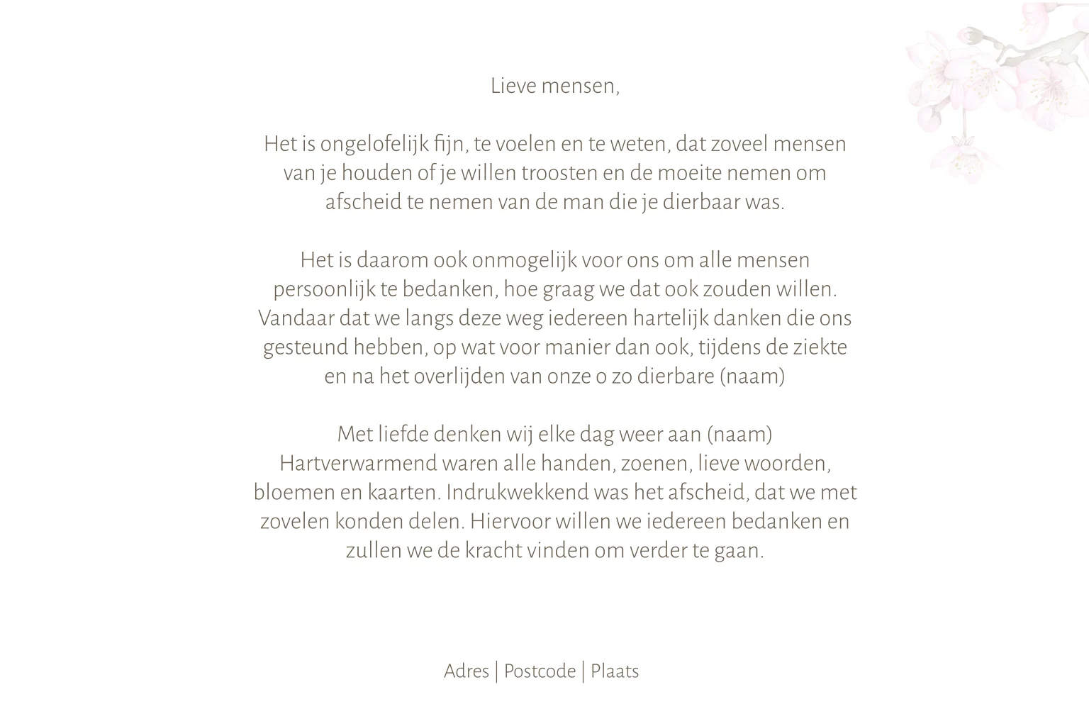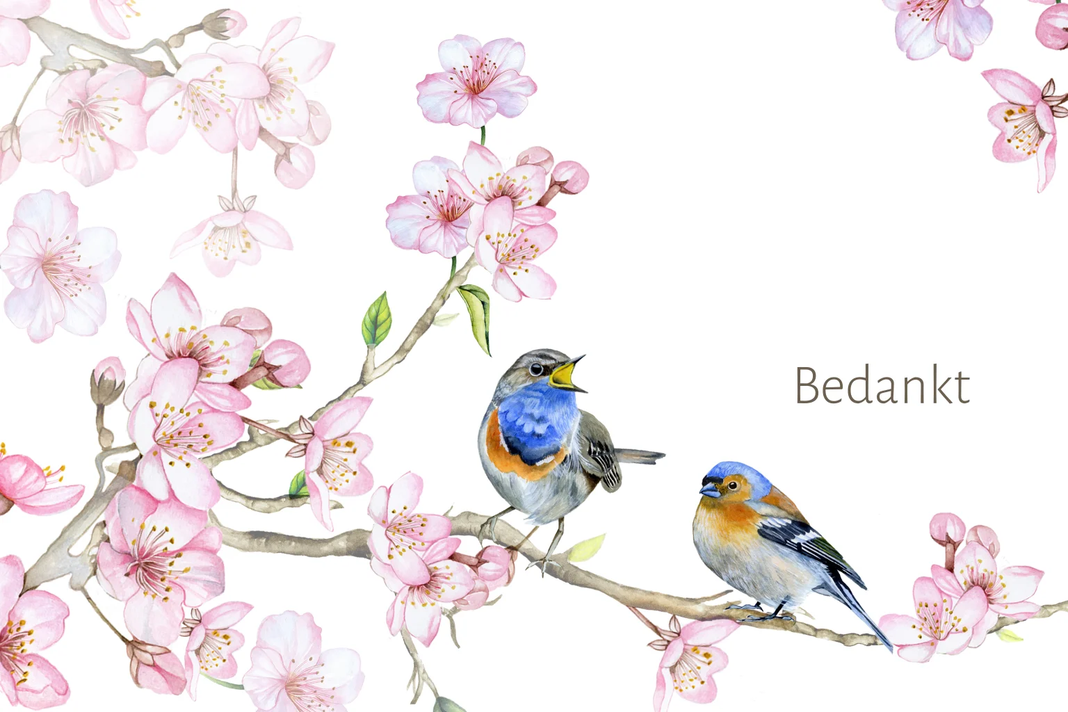 Bedankkaart na overlijden met vogels roodborstje en roze bloemen bloesem