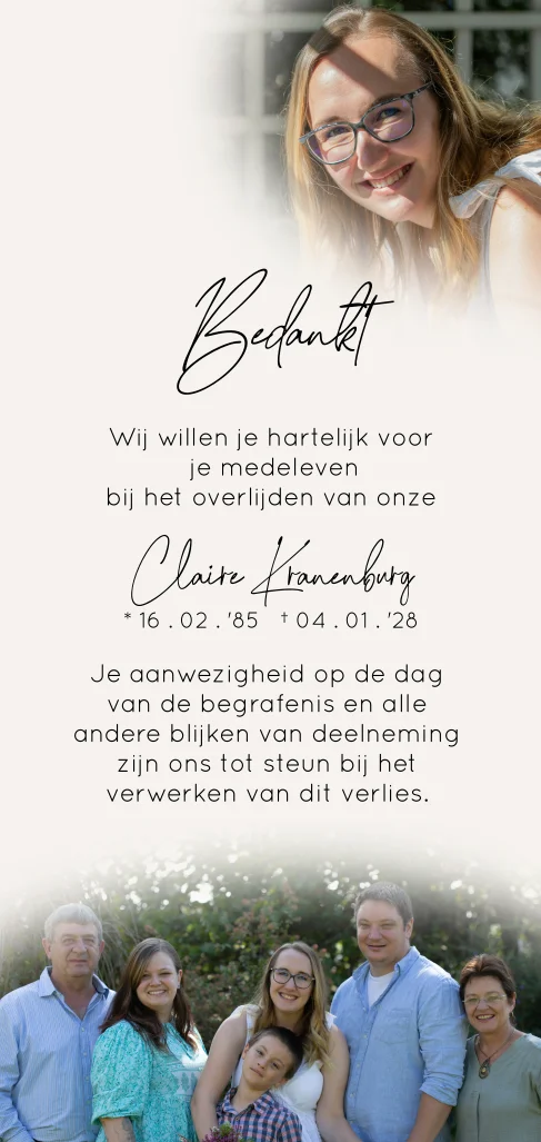 Moderne foto bedankkaart voor een vrouw met ruimte voor 2 foto's zoals een familiefoto en een portret.