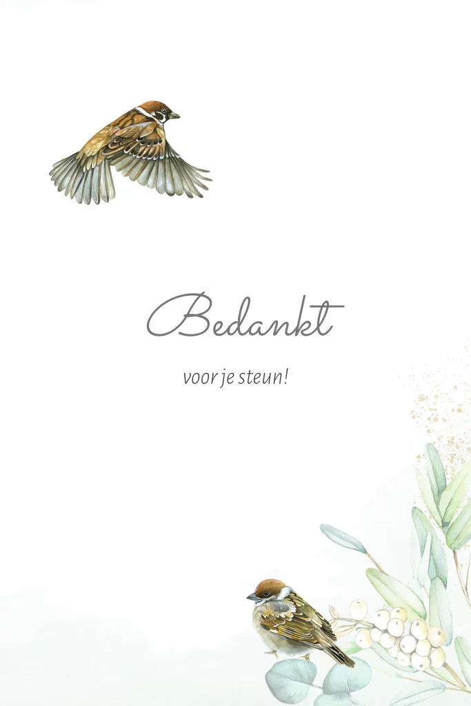 Bedankkaart na overlijden met mus: Op deze bedankkaart na overlijden staan twee mussen vogels afgebeeld. De kaart is botanisch getekend en heeft een natuurlijke uitstraling door de groene kleuren. De vogels zijn watercolour illustraties en staan symbool voor degene die is overleden (888)