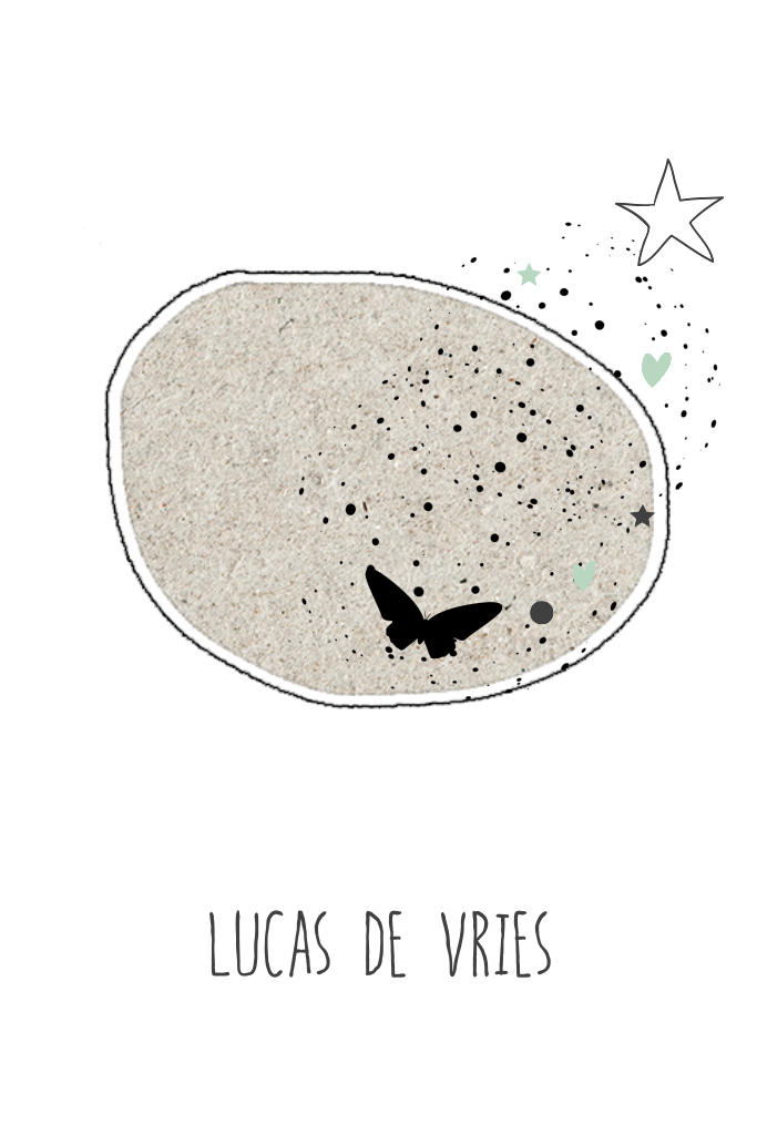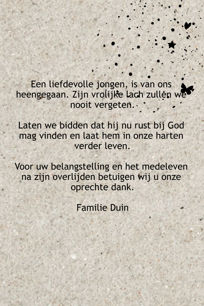 Stijlvol bidprentje kind of baby met wit als basis. Met speelse ronding van karton look, sterren, hartjes, spetters en vlinders. Alles is te bewerken. (420)