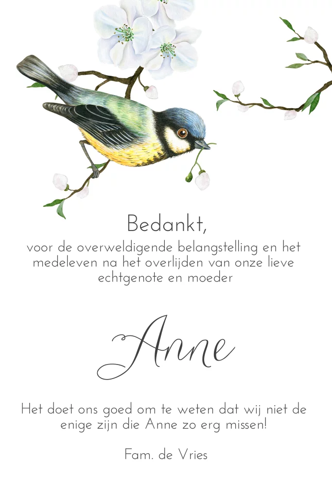 Bedankkaart na overlijden witte bloemen en koolmeesje