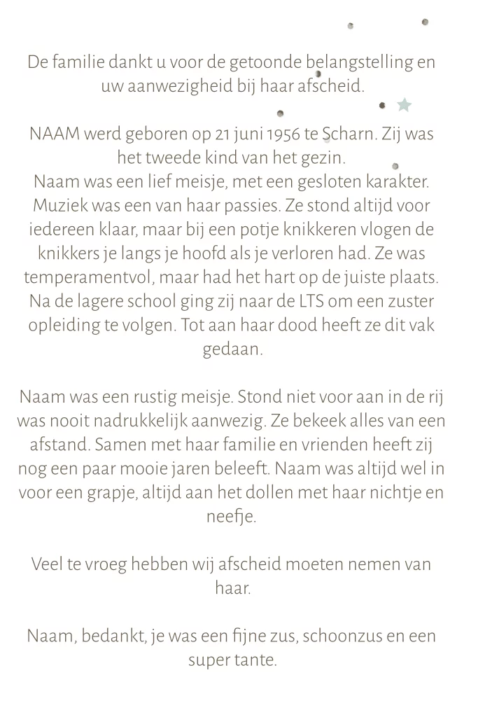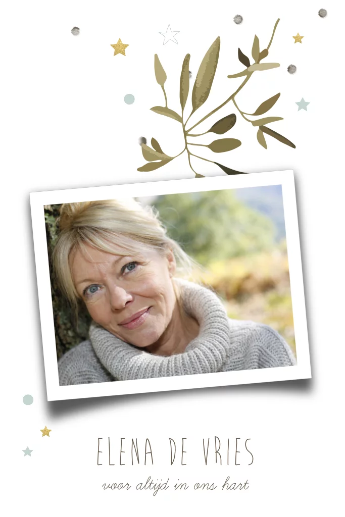 Moderne staande herinneringskaart / bidprentje met wit als basis en foto kader. Met nonchalant vallend blad omringd met lieve sterren en stippen. Alles is zelf aan te passen. (372)