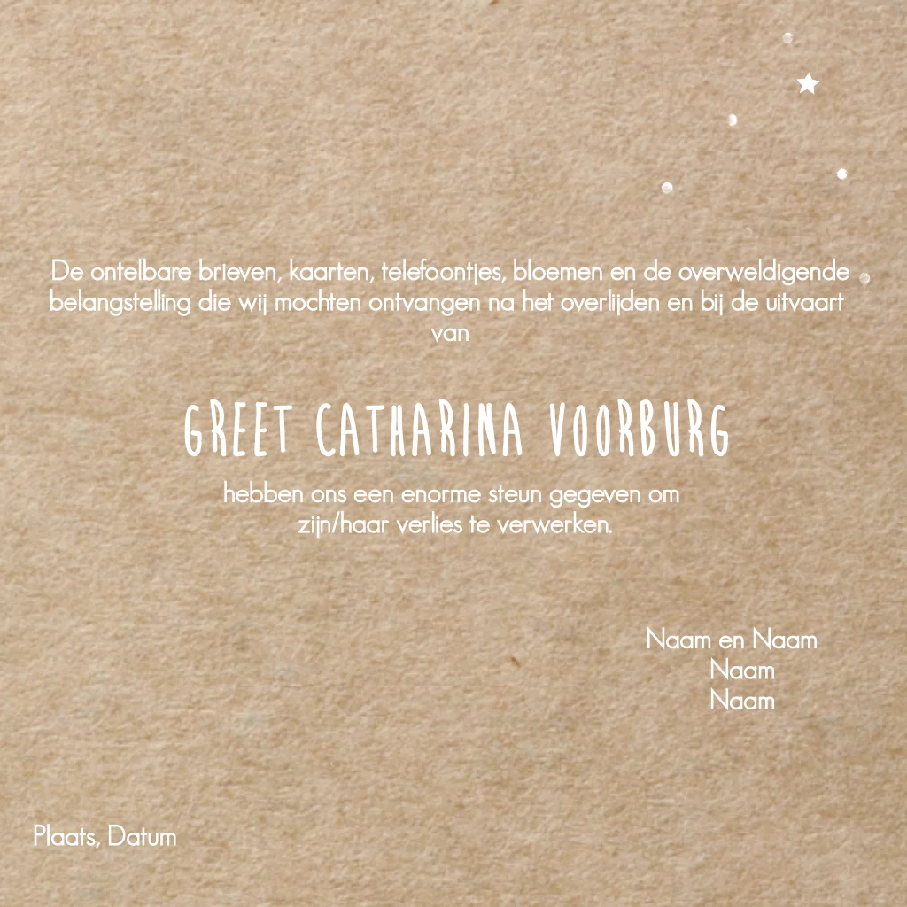 Dankbetuiging na overlijden met een kraft look achtergrond. Voor een vrouw met ruimte voor het plaatsen van een eigen foto.Met groen olijftakje. (369)