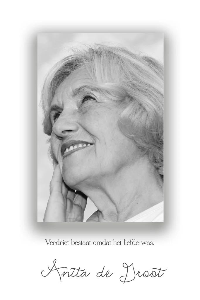 Herinneringskaart met ruimte voor een eigen foto. Door de schaduwrand rondom de foto lijkt het of deze uit de kaart komt / er bovenop ligt. Een liefdevolle herinnering aan een overleden dierbare.