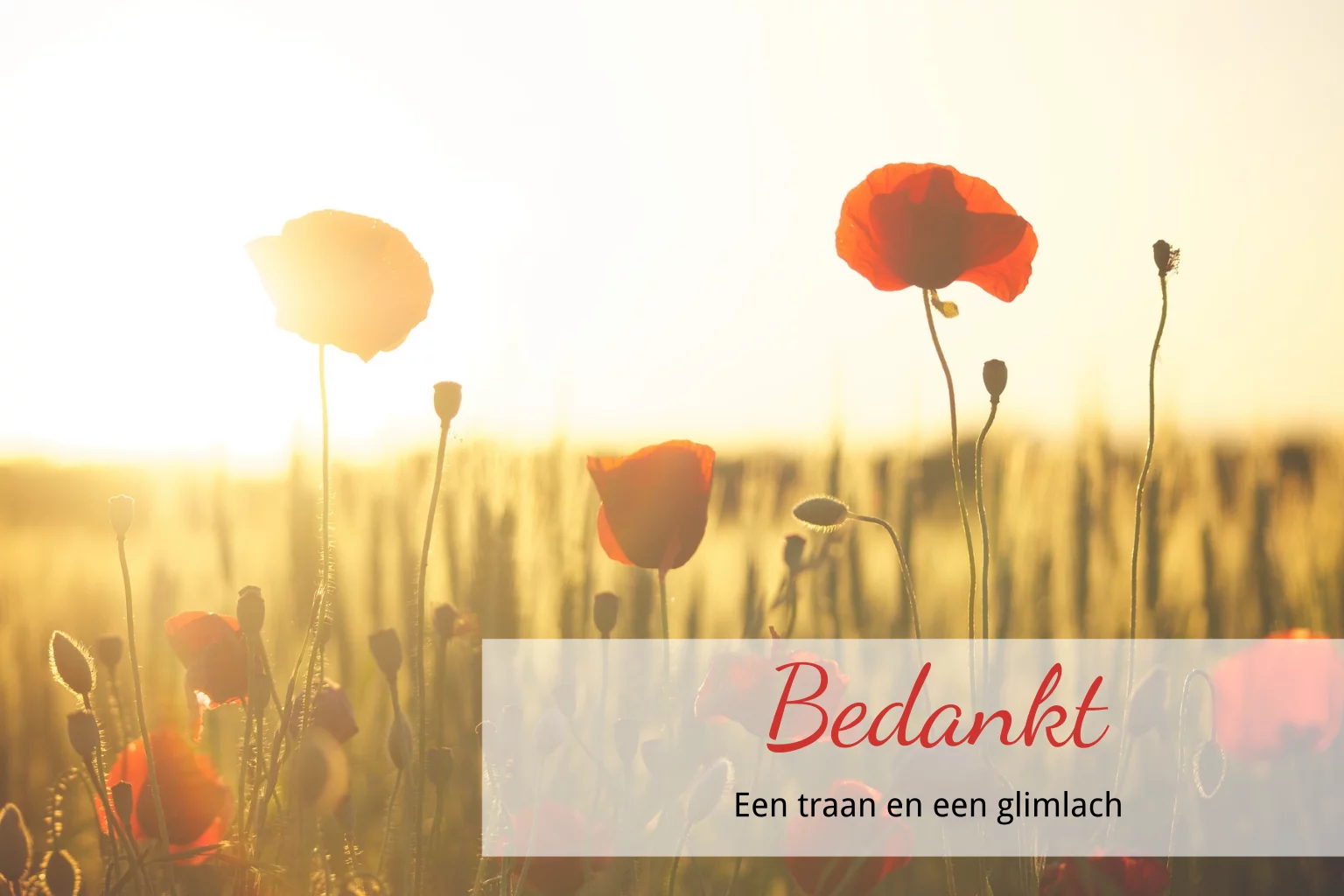 Klassieke bloemen dankbetuiging met rode klaprozen in het veld. Met zonsondergang. Wit balkje met naam erin. (30)