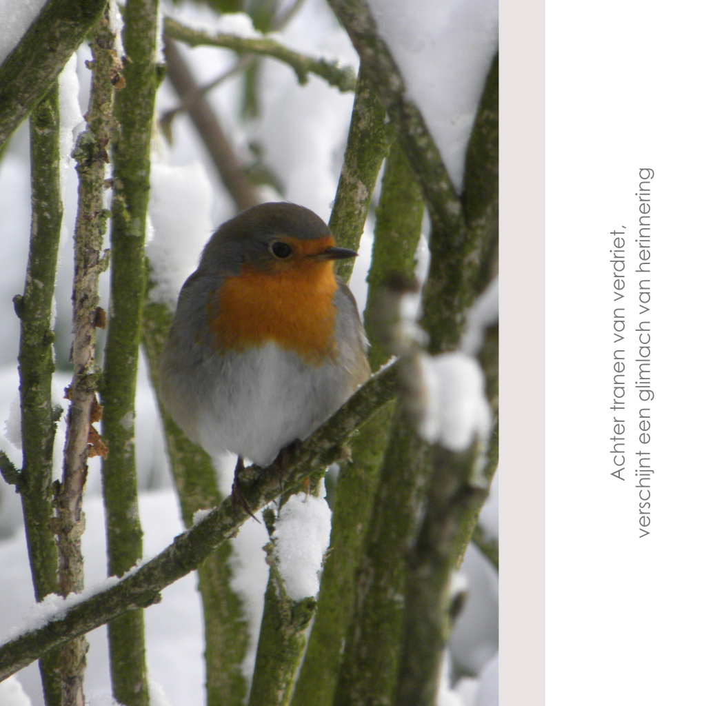 Bedankkaart na overlijden met roodborstje op winterse tak