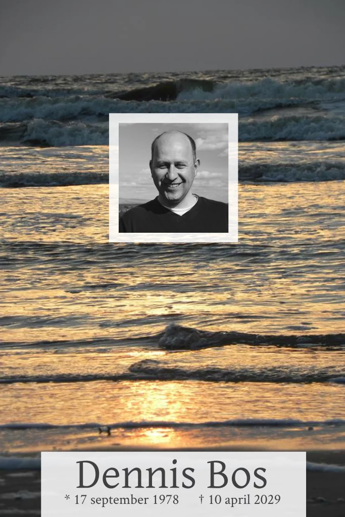 Mooie herinneringskaart met foto van de branding zee en zonlicht. De naam en een foto van de overledene op de voorzijde.