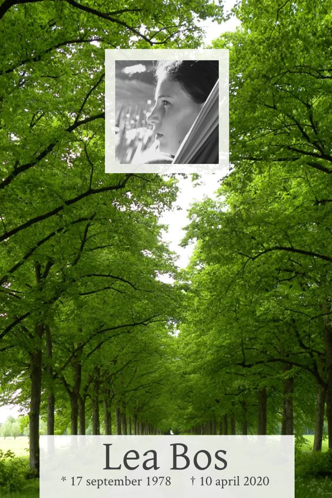 Mooie herinneringskaart met foto van groene bomenlaan. De naam en een foto van de overledene op de voorzijde.