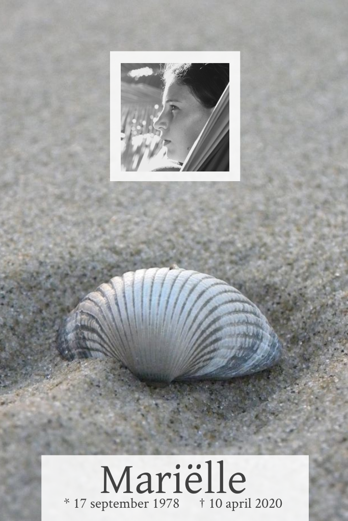 Mooie herinneringskaart met foto van zand en grote schelp. De naam en een foto van de overledene op de voorzijde.
