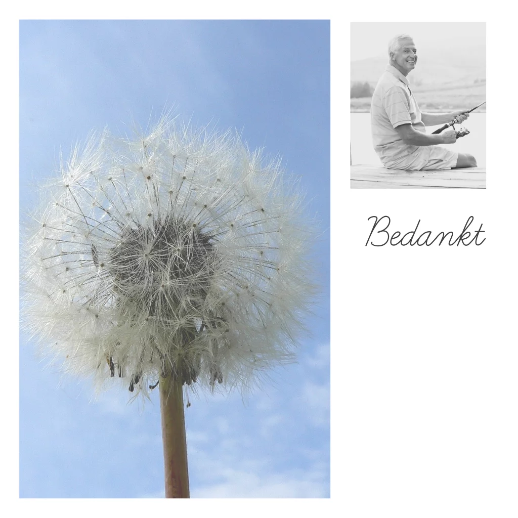 Mooie moderne bedankkaart met eigen foto en paardebloem. Met witte kader randen. Alle teksten en kleuren zijn naar keuze aan te passen. (10)