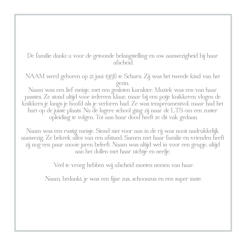 Traditionele herinneringskaart gemakkelijk online maken met grijze rouwrand. Alle teksten en kleuren zijn naar keuze aan te passen. (41)