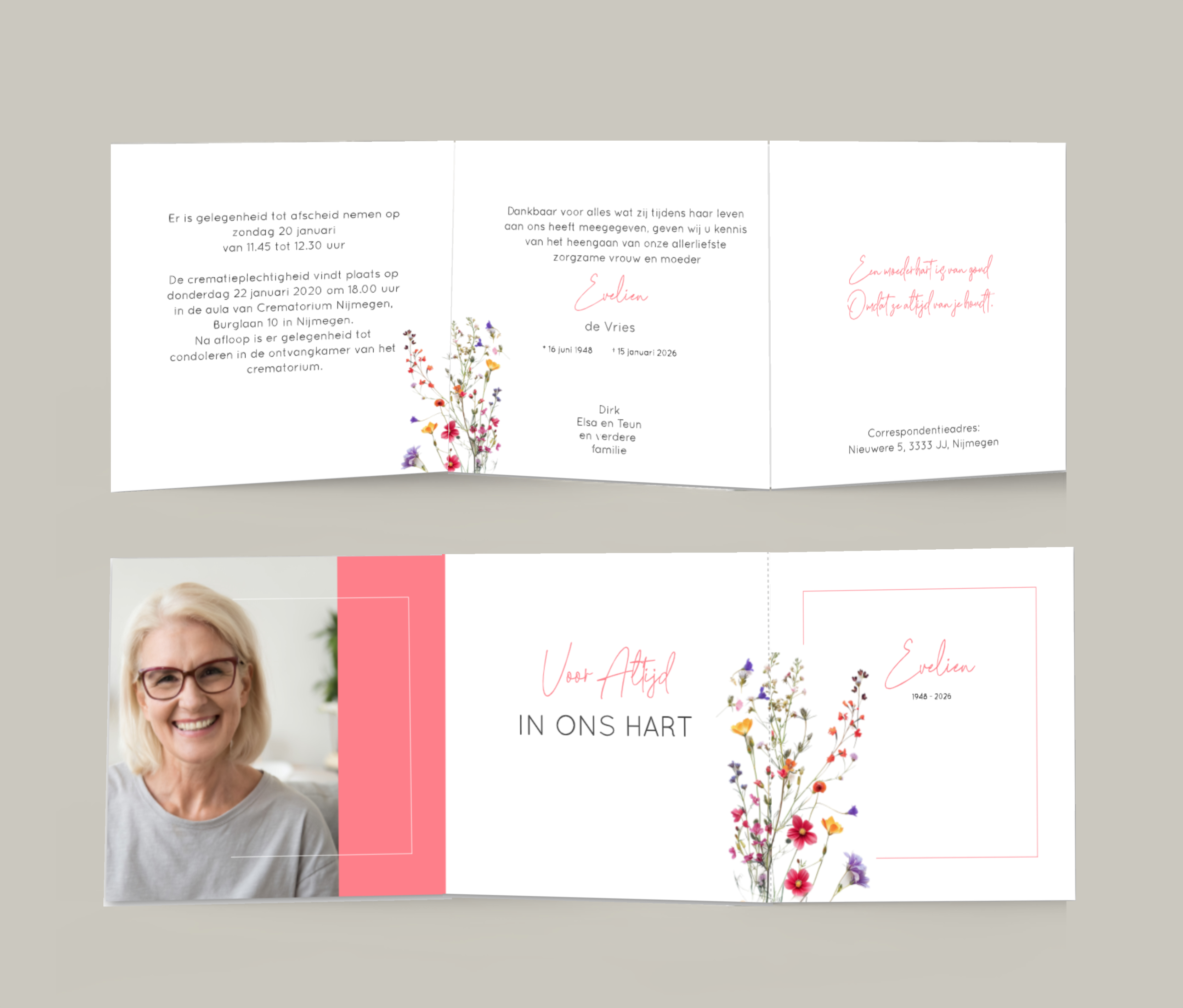 Drieluik rouwkaart modern bloemen eigen foto roze