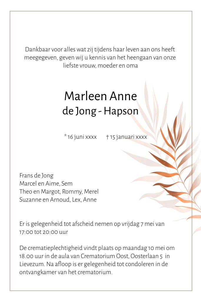 Klassieke rouwbrief vrouw met blad