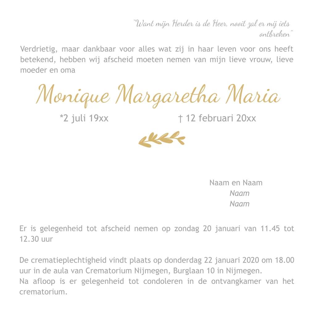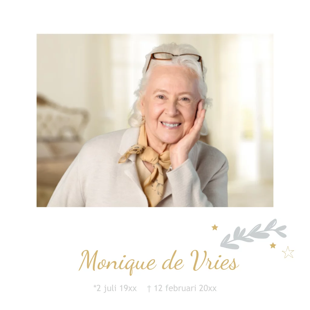 Strakke vierkante rouwkaart met wit als basis. Met ruimte voor een eigen foto op de voorzijde. Met ster en grafisch getekend blad in het grijs en oker kleur. Alles is om te kleuren en zelf naar eigen wens te maken. (430)