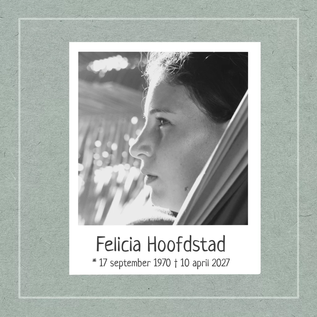 Foto rouwkaart voor een vrouw met wit rouwkader op blauw grijs papier