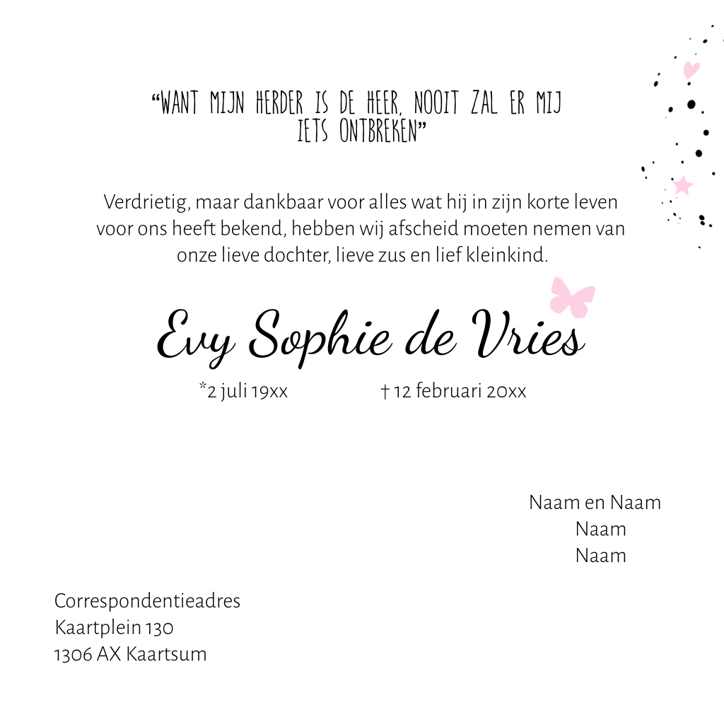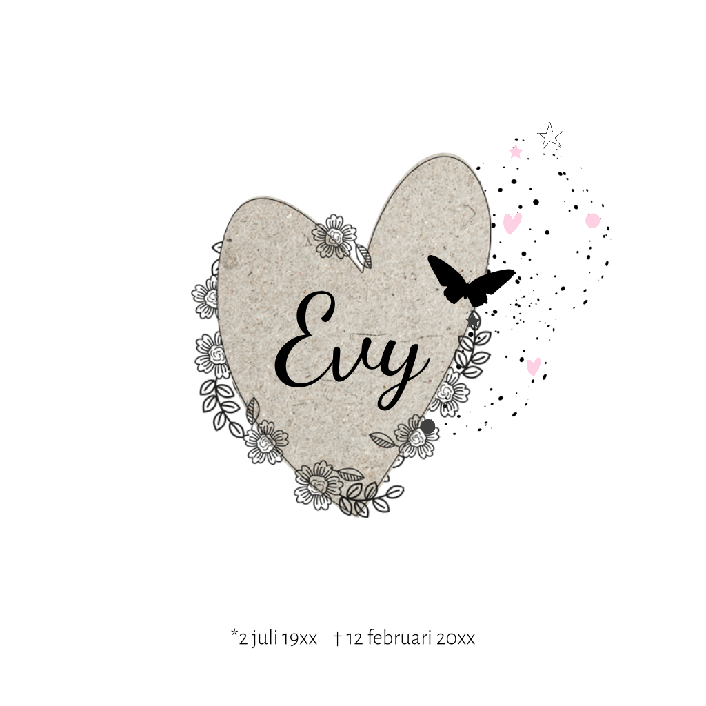 Stijlvolle rouwkaart meisje kindje met wit als basis. Met een speels hart van karton look met lijn tekening blad en bloem, sterren, hartjes, spetters en vlinders. Alles is te bewerken. (419)