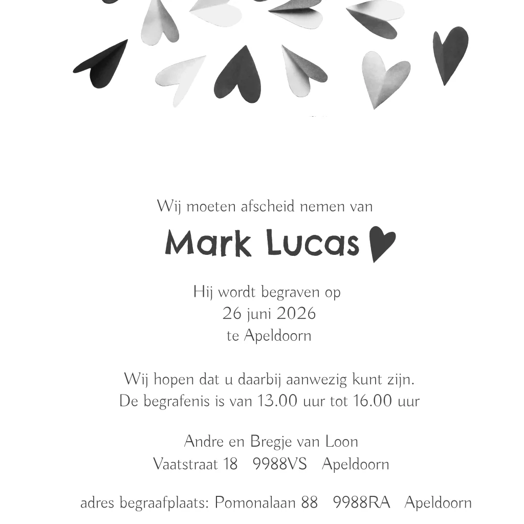 Kinder rouwkaart polaroid met foto en grijze hartjes. (353)