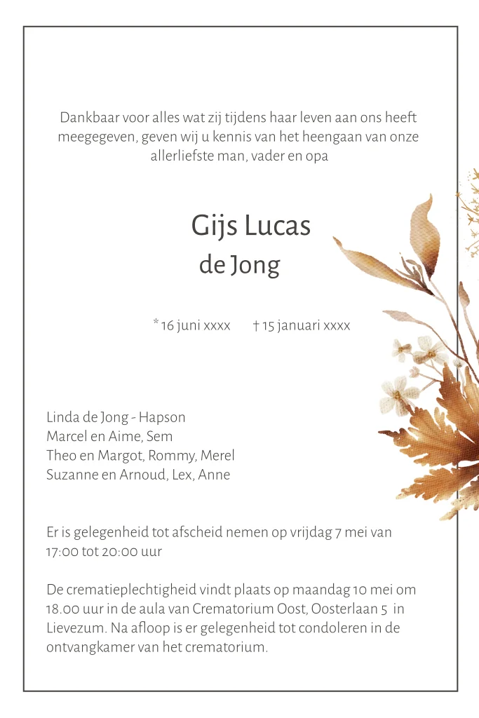 Rouwbrief voor een man met leuke takjes en bladeren. (940)