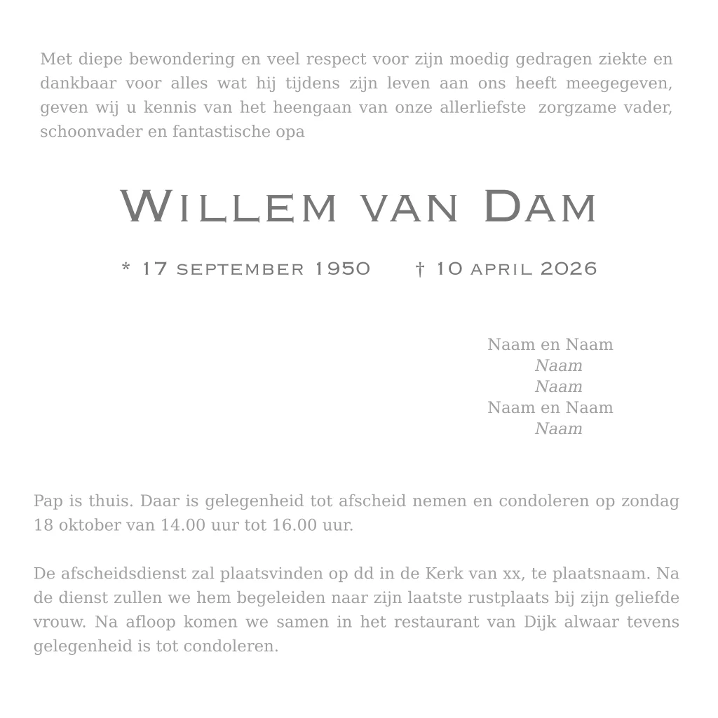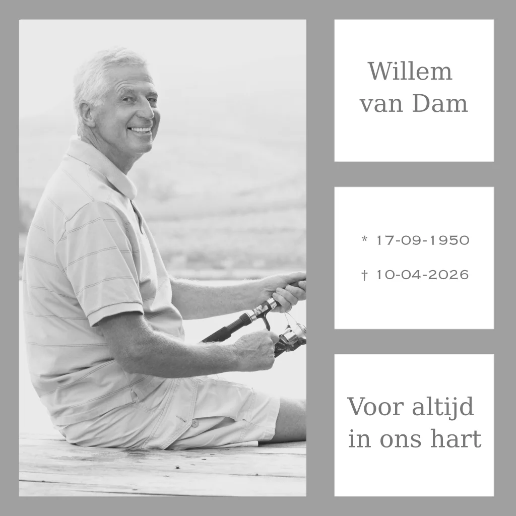Moderne rouwkaart grijze randen en eigen foto met kaders. Alle kleuren, teksten en foto's zijn door uw zelf aan te passen. (8) TIP: Bekijk onze ruime collectie rouwkaarten via > Rouwkaarten