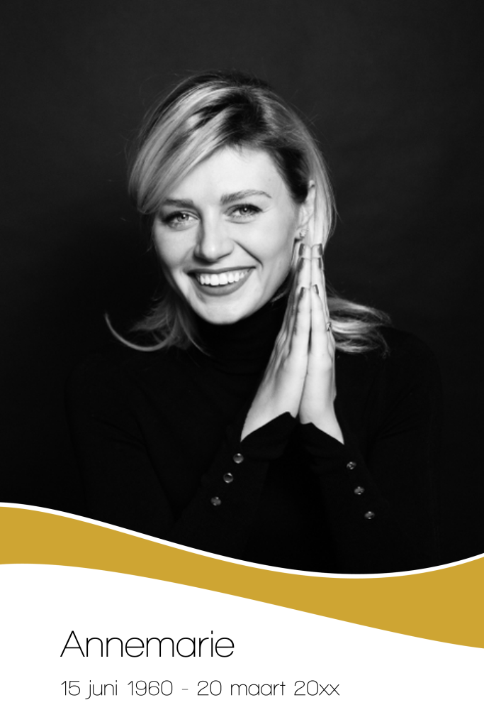 Stijlvolle rouwkaart met ruimte voor 2 foto's. Eentje op de voorkant en eentje op de achterzijde van de kaart. Denk aan 2 portretten of aan een bijzondere hobby of passie van de overledene. De kleur van de boog kan naar eigen wens aangepast worden. (827)