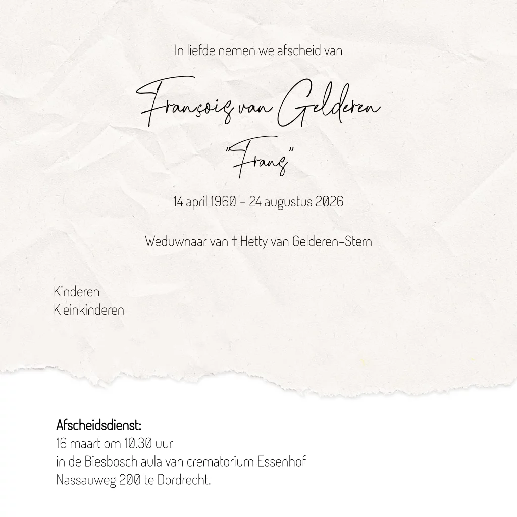 Moderne rouwkaart met gescheurd papier en een zwart wit foto. Deze kaart is perfect voor het uitnodigen van dierbaren voor een afscheidsceremonie en het delen van mooie herinneringen. De combinatie van het gescheurde papier en de zwart-wit foto geeft deze rouwkaart een clean en simpel ontwerp, perfect voor het overbrengen van een boodschap van rouw en dankbaarheid. De zwart-wit foto voegt een persoonlijk tintje toe, waardoor deze kaart een mooie herinnering wordt aan de overledene. (1095)