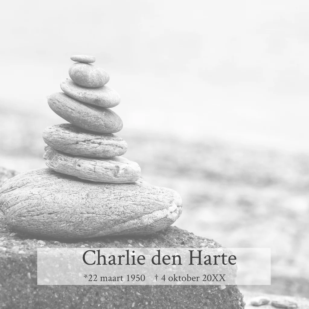 Moderne rouwkaart met zwart wit foto stapelstenen. Steenmannetje/ Steenman. Alle teksten en kleuren zijn naar keuze aan te passen. (629)