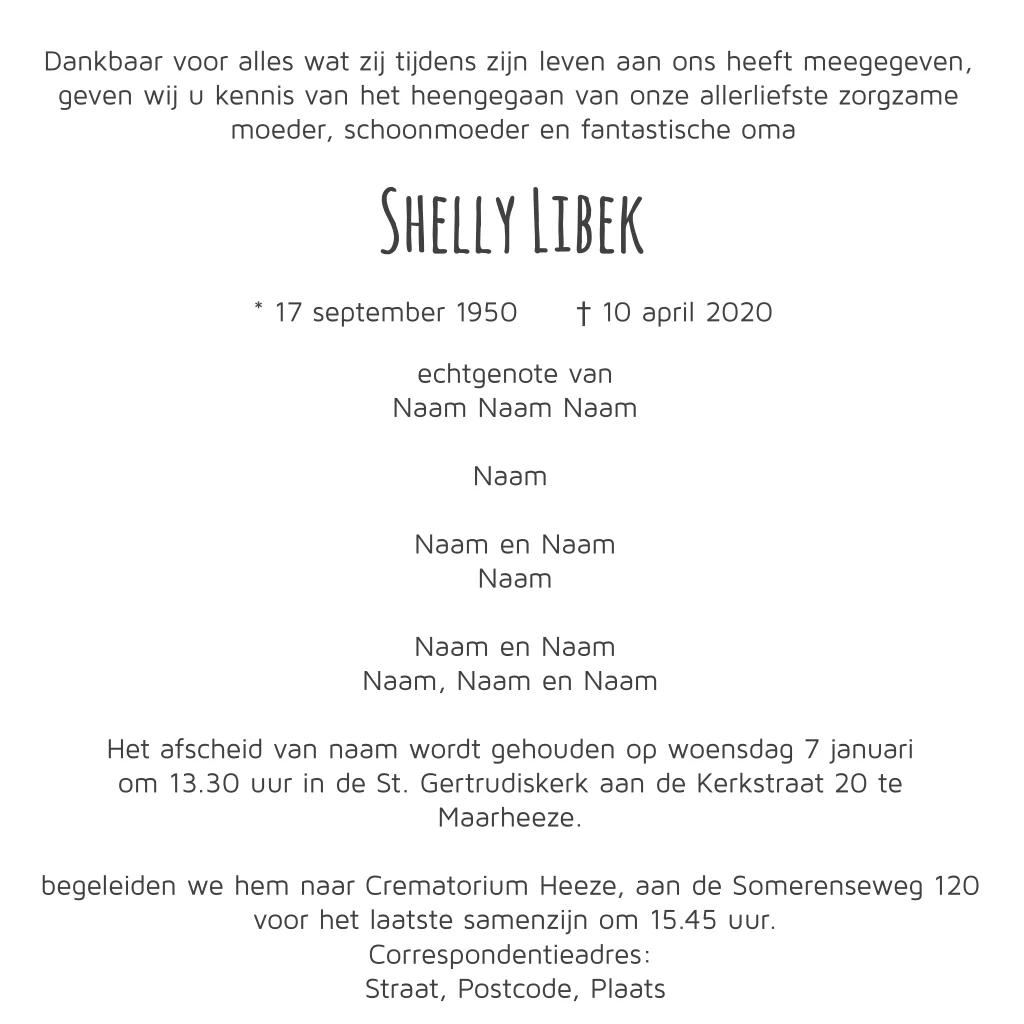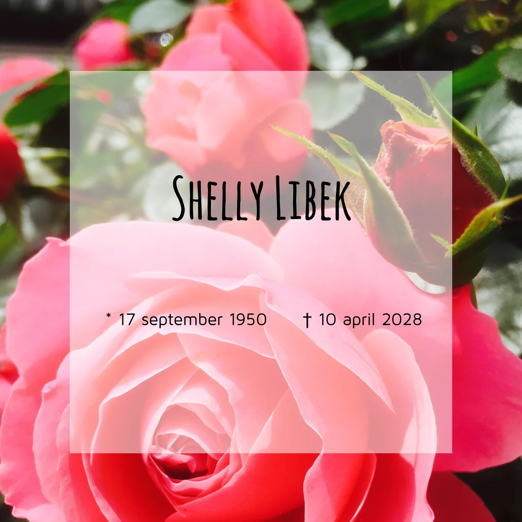Moderne rouwkaart met roos in roze en rood. Met de naam van de overledene op de voorzijde.