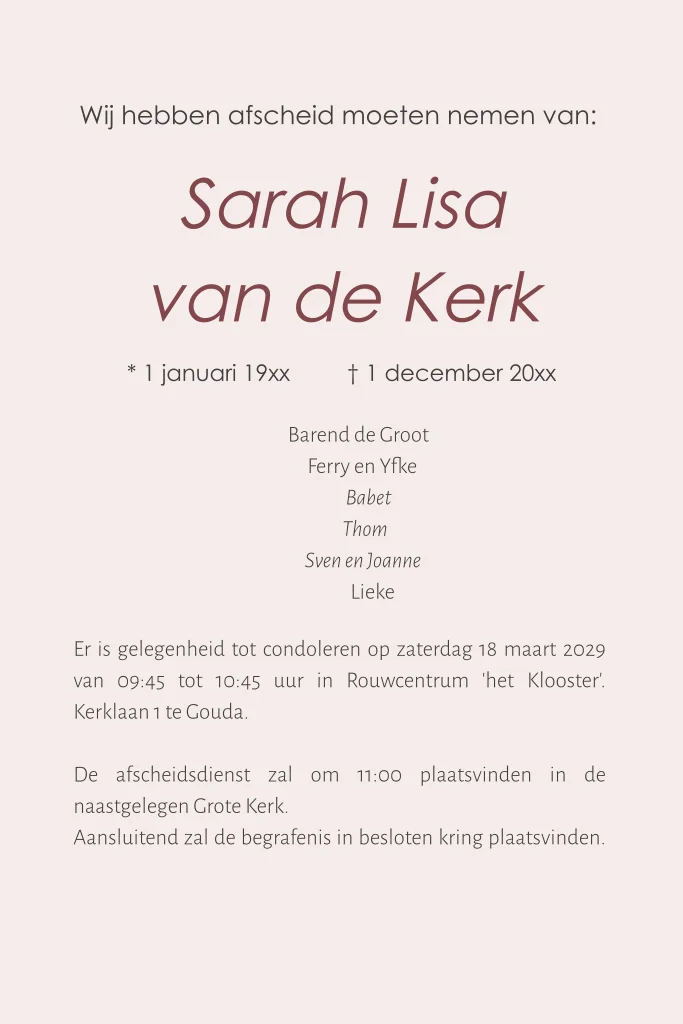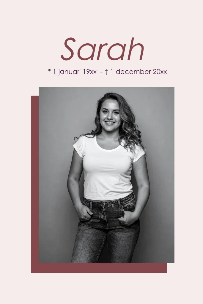 Een moderne rouwkaart voor een vrouw met een kleurenvlak en ruimte voor het plaatsen van een eigen foto.