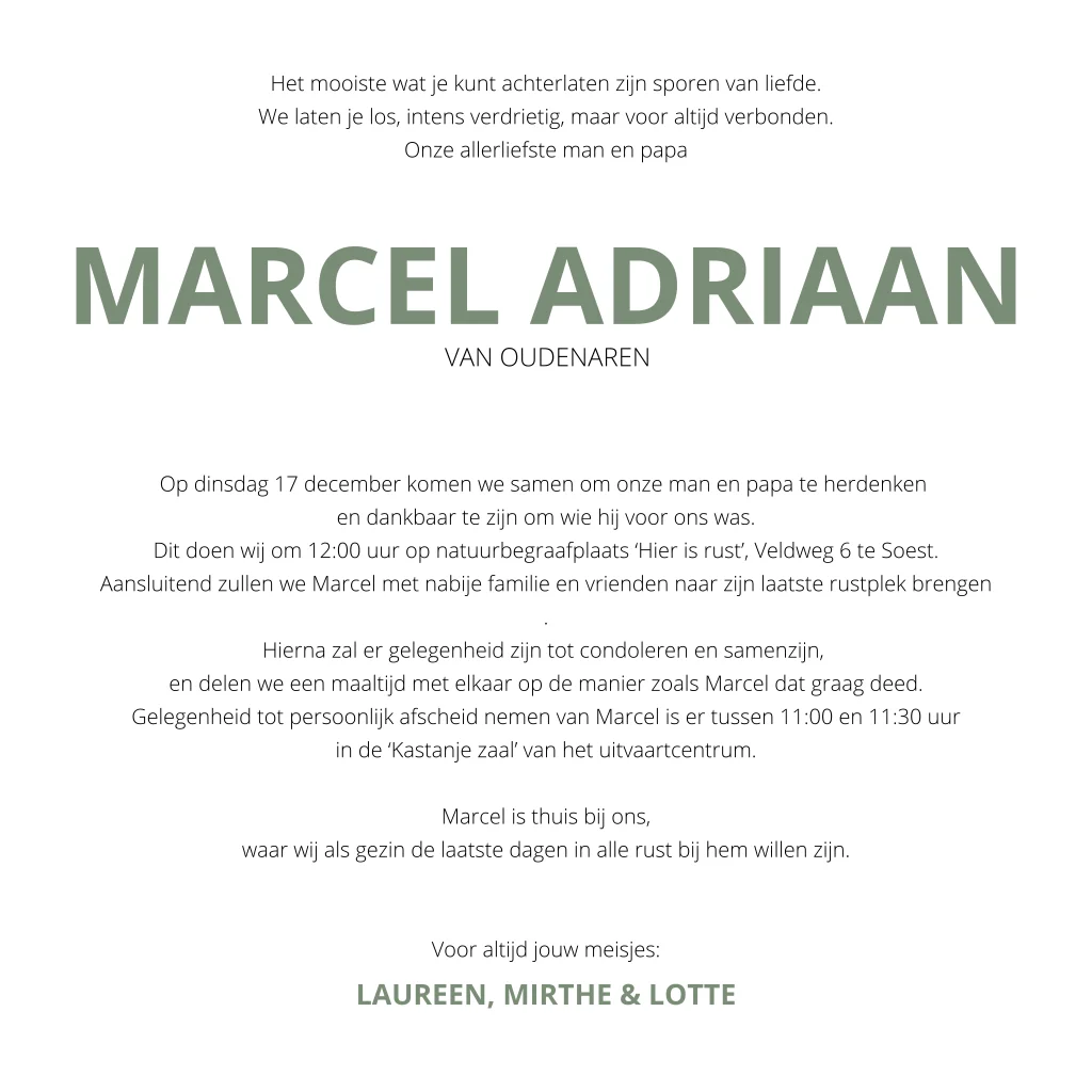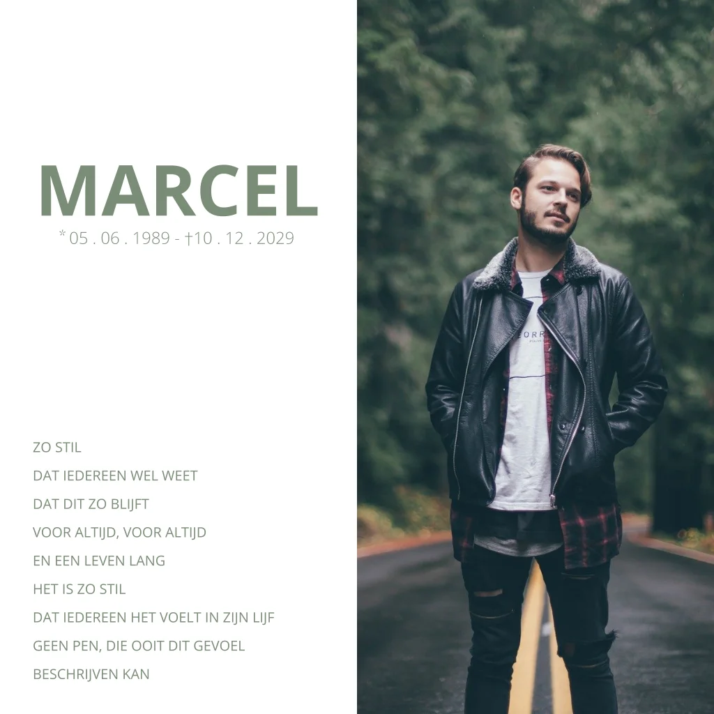 Pas deze eigentijdse rouwkaart zelf aan in de editor. Vervang de voorbeeldfoto voor een eigen foto en pas de kleur van de teksten daar eventueel op aan. (994)