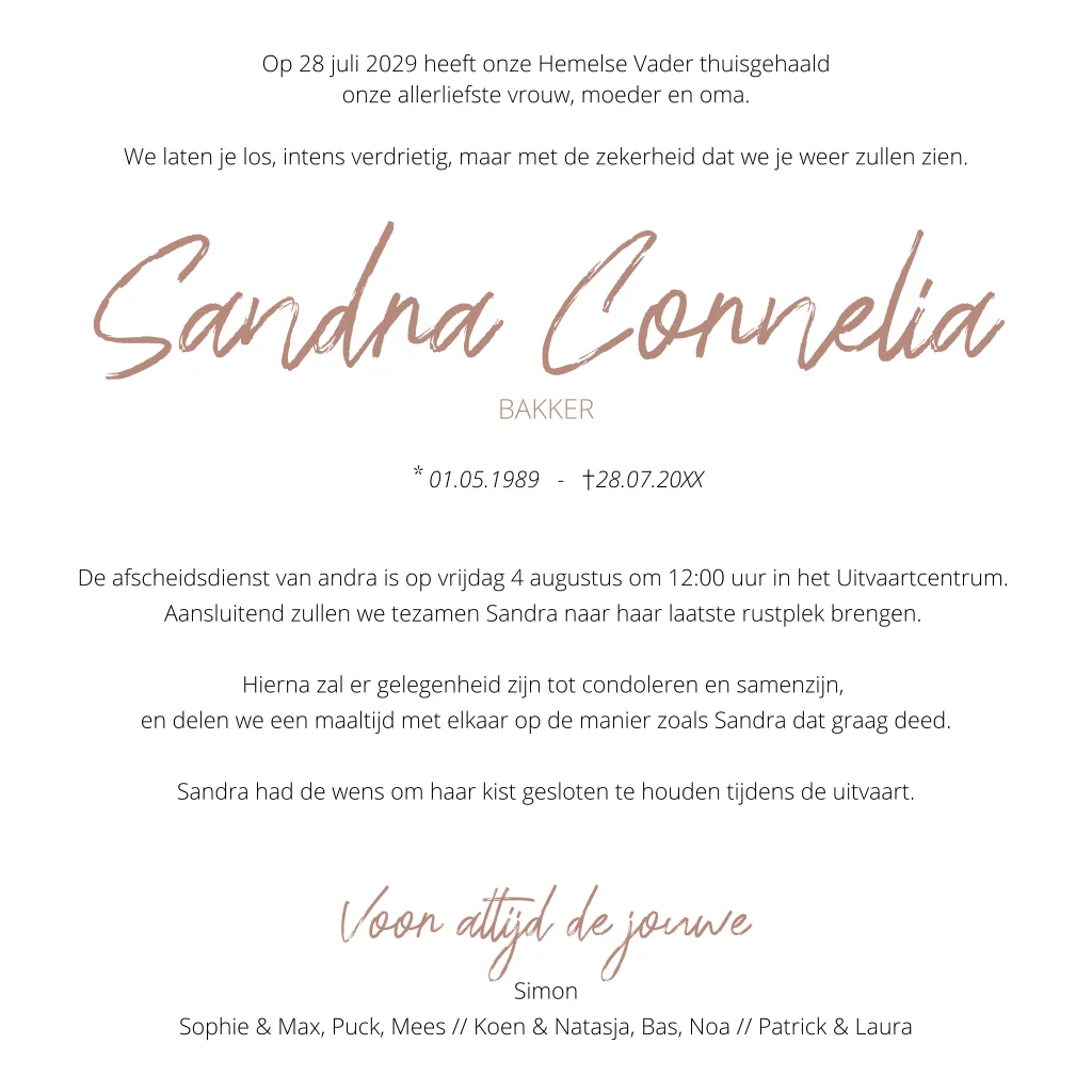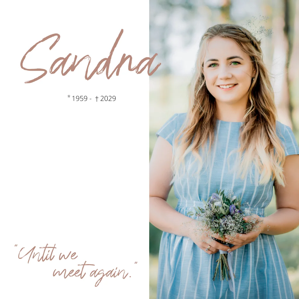 Pas deze eigentijdse rouwkaart zelf aan in de editor. Vervang de voorbeeldfoto voor een eigen foto en pas de kleur van de teksten daar eventueel op aan. (1001)