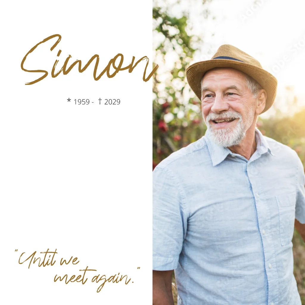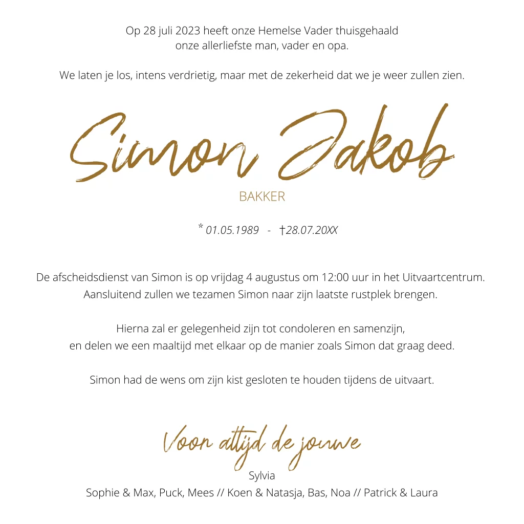Pas deze eigentijdse rouwkaart zelf aan in de editor. Vervang de voorbeeldfoto voor een eigen foto en pas de kleur van de teksten daar eventueel op aan. (1001)