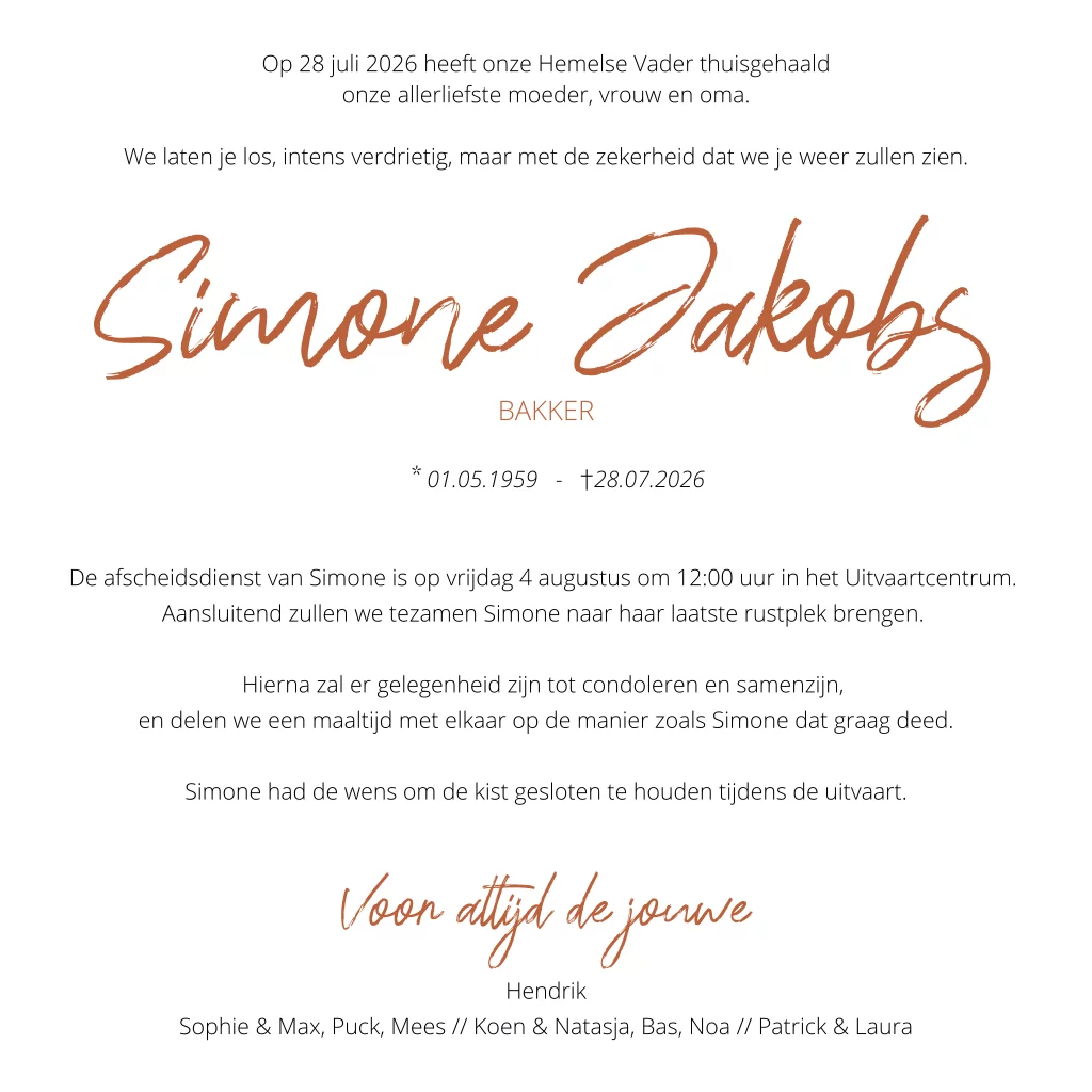 Pas deze rouwkaart zelf aan in de editor. Vervang de voorbeeldfoto voor een eigen foto en pas de kleur van de teksten daar eventueel op aan. (1001)