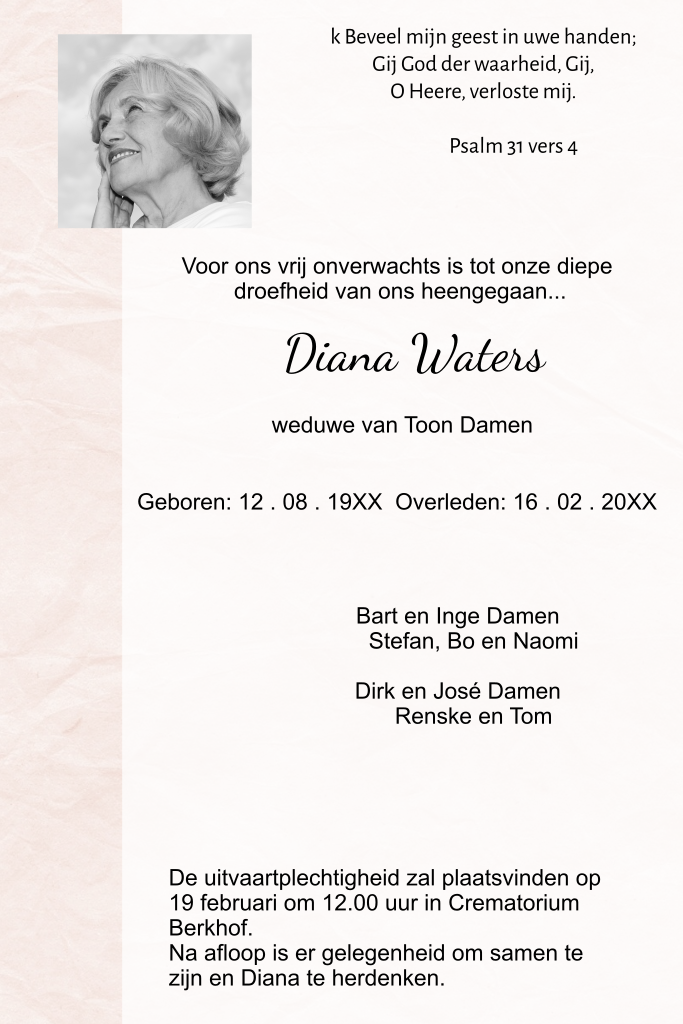 Mooie rouwbrief met roze papier en eigen foto. Voor een traditionele rouwbrief adviseren wij u te bestellen op biotop 195 grams papier, formaat 14x21 met een biotop rouw-envelop.