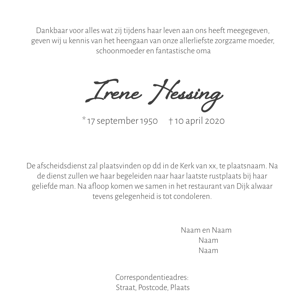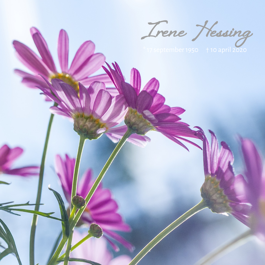 Moderne rouwkaart met paarse chrysanten. Alle teksten zijn naar keuze aan te passen en ook de foto is te vervangen door een eigen versie (9999)