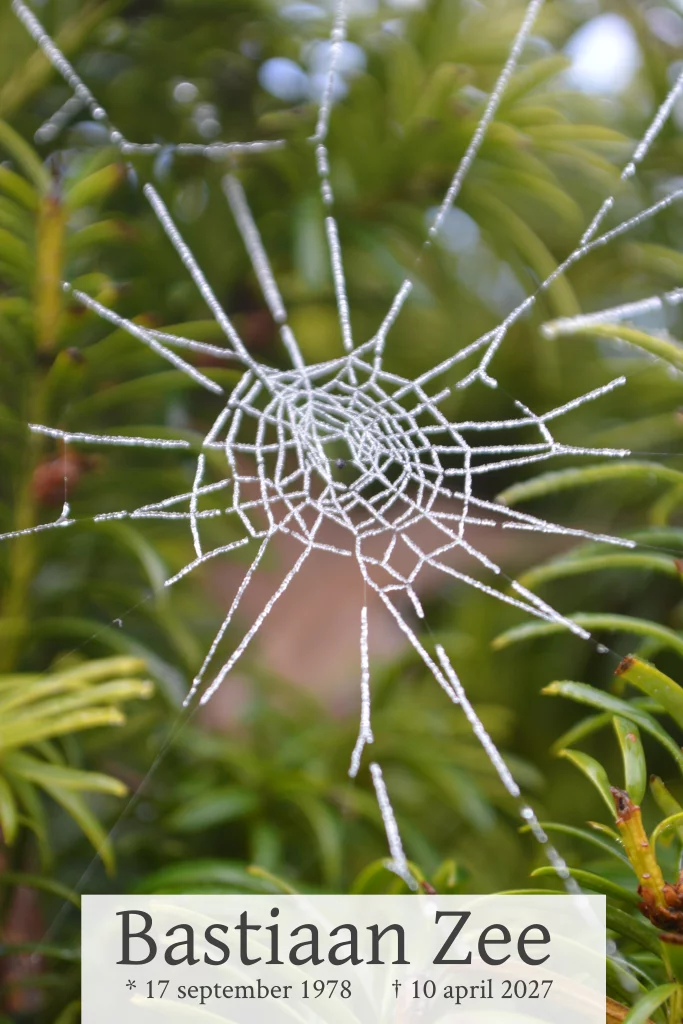 Rouwkaart met foto van bevroren spinnenweb in tuin. De naam van de overledene op de voorzijde. Voor winters thema