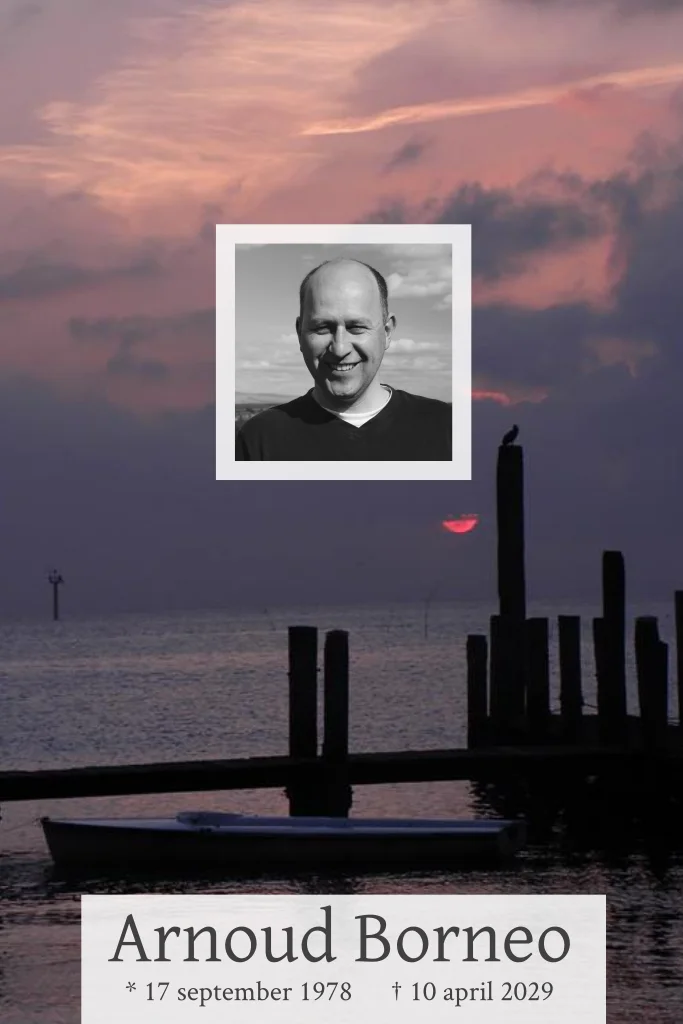 Mooie rouwkaart met foto paars roze lucht en bootje