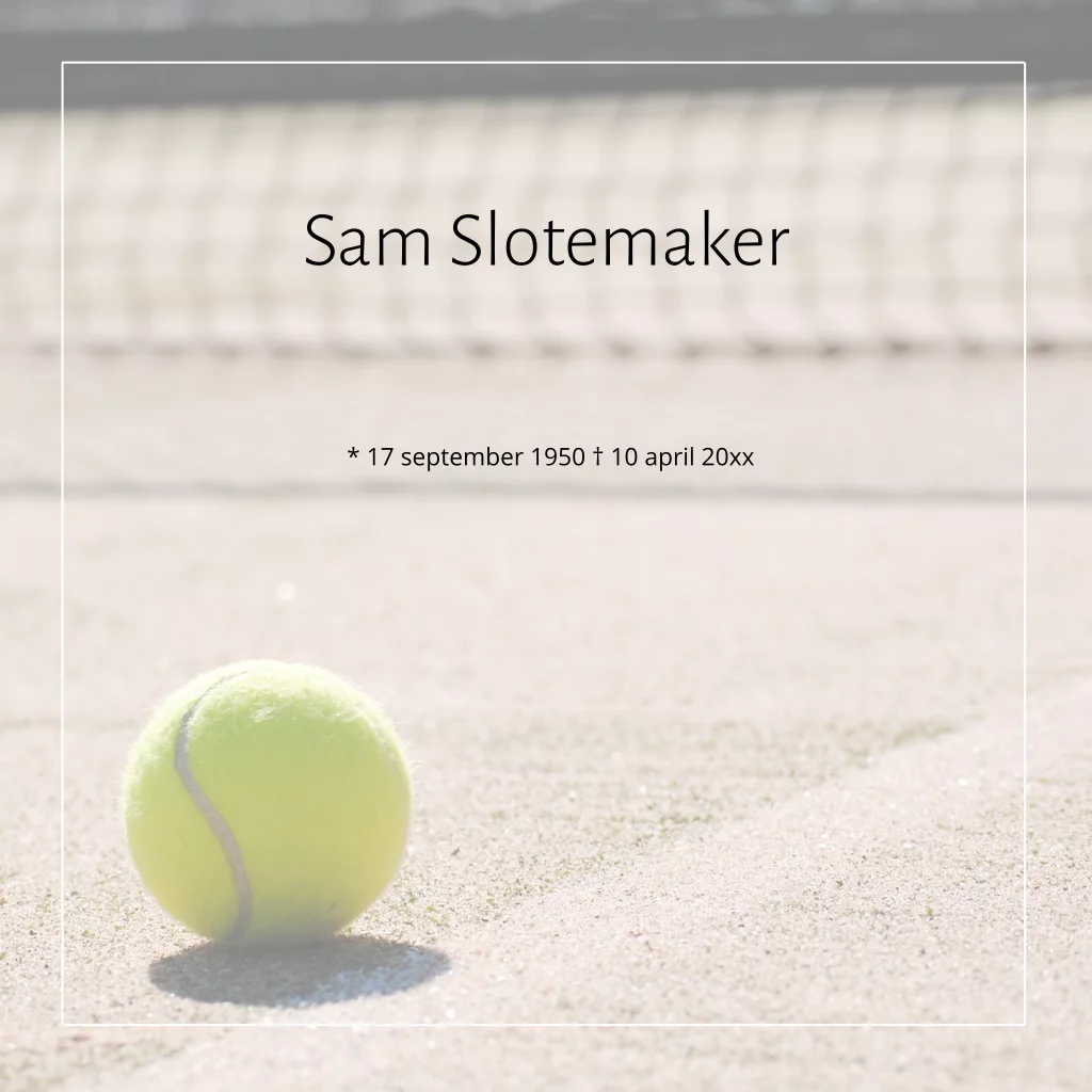 Mooie rouwkaart met tennisbal. Het is mogelijk om een eigen foto toe te voegen en de rouwrand te verwijderen. (9999)
