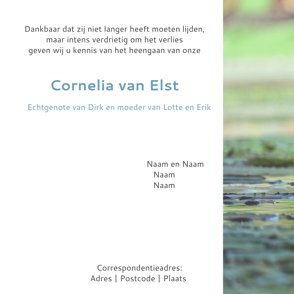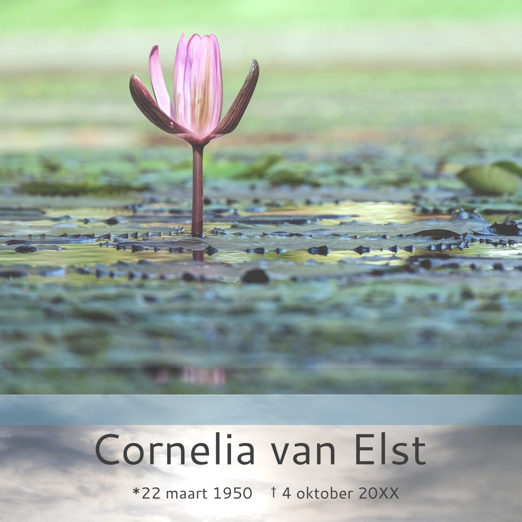 Mooie rouwkaart vrouw of man met paarse waterlelie en veel groen. Met de lucht en water in de ochtend. (22)