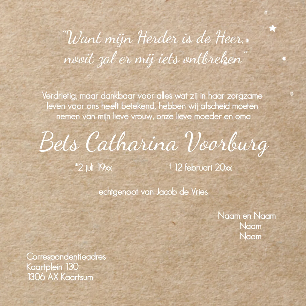 Dubbele rouwkaart met kraft print als basis. Ruimte voor een eigen foto op de voorzijde, stippen, sterren, en geïllustreerd vallend blad. Zelf maken. (370)