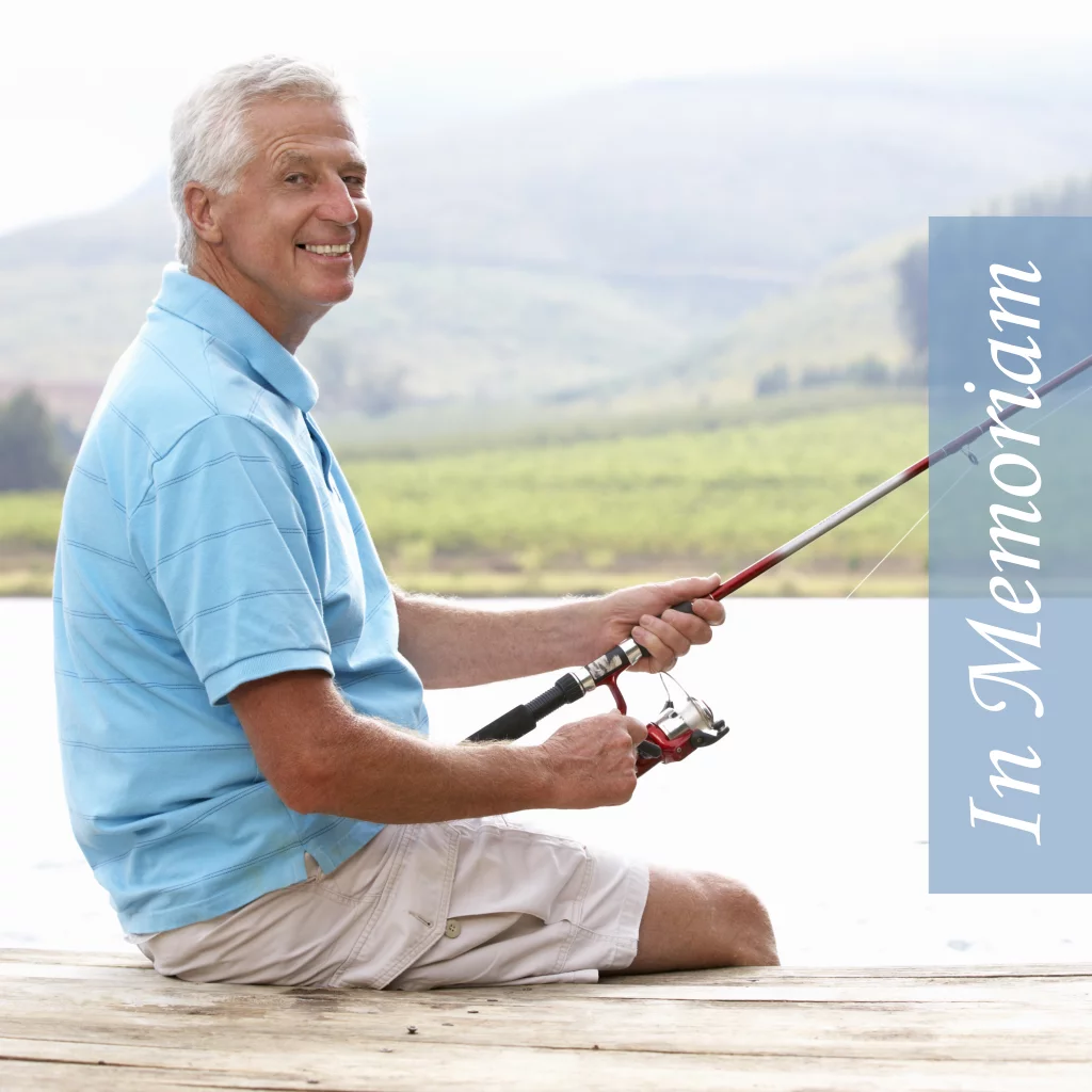 Stijlvolle rouwkaart of overlijdens bericht met foto van een visser met een hengel. Plaats uw eigen foto. Tekst In memoriam kan verplaatst worden.