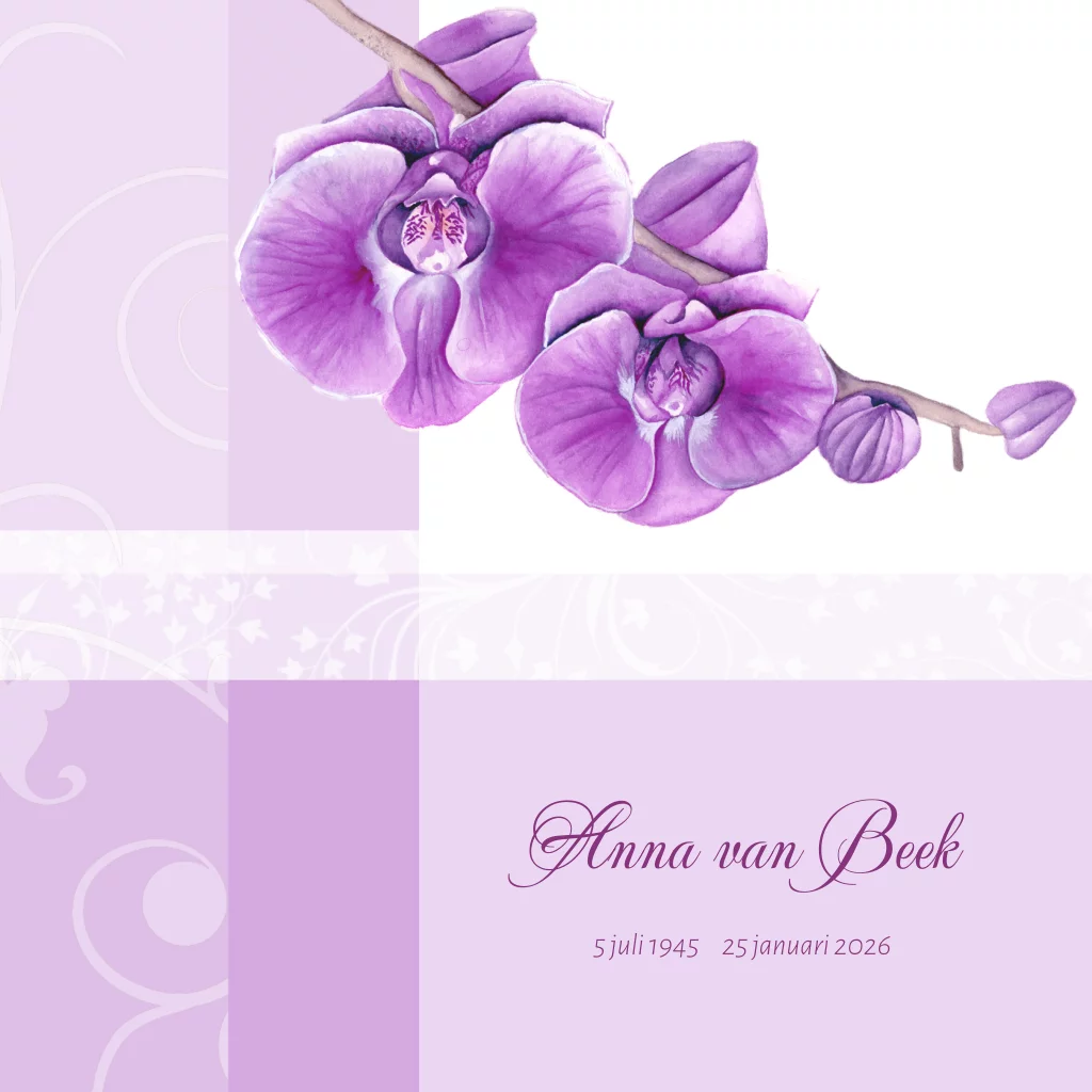 Rouwkaart voor een vrouw met een getekende paarse orchidee bloem