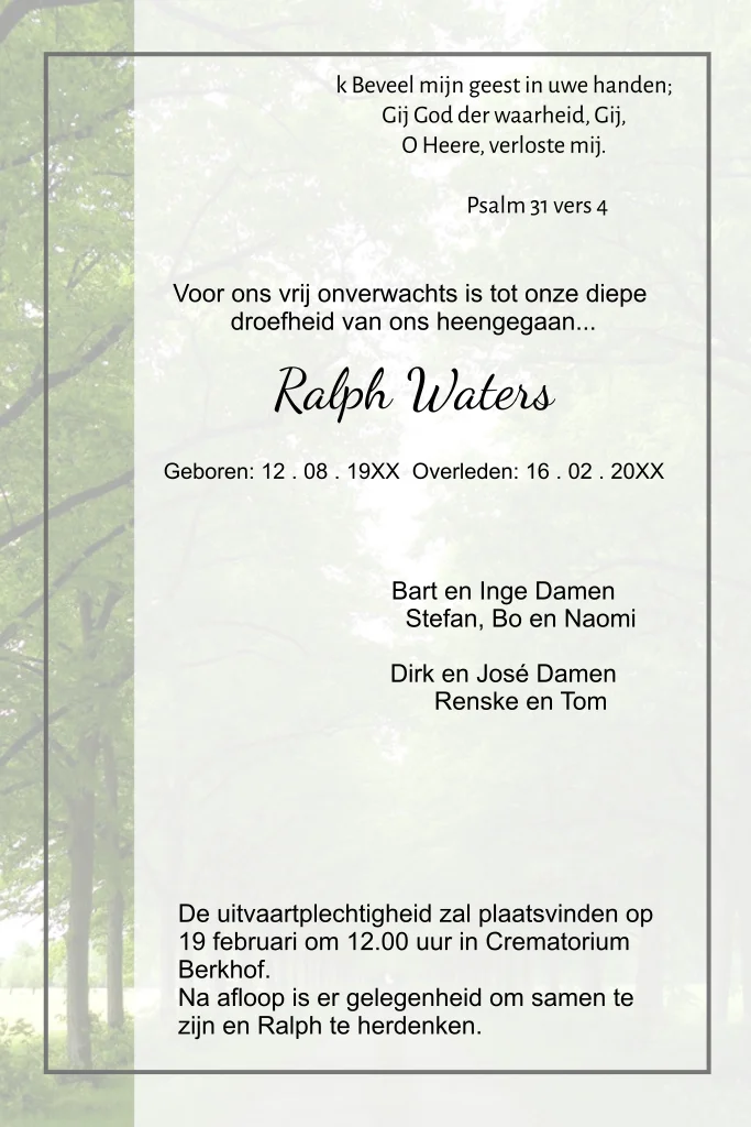 Mooie rouwbrief met rij bomen op de achtergrond. Voor een traditionele rouwbrief adviseren wij u te bestellen op biotop 195 grams papier, formaat 14x21 met een biotop rouw-envelop.