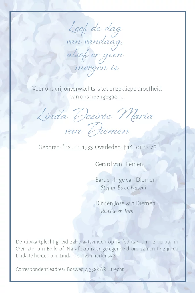 Rouwbrief met op de achtergrond blauwe hortensia's. (1232)