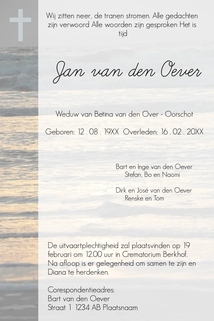 De foto is ook te vervangen door een eigen versie. Voor een traditionele rouwbrief adviseren wij u te bestellen op biotop 195 grams papier, formaat 14x21 met een biotop rouw-envelop. TIP: Bekijk onze ruime collectie rouwkaarten via > Rouwkaarten