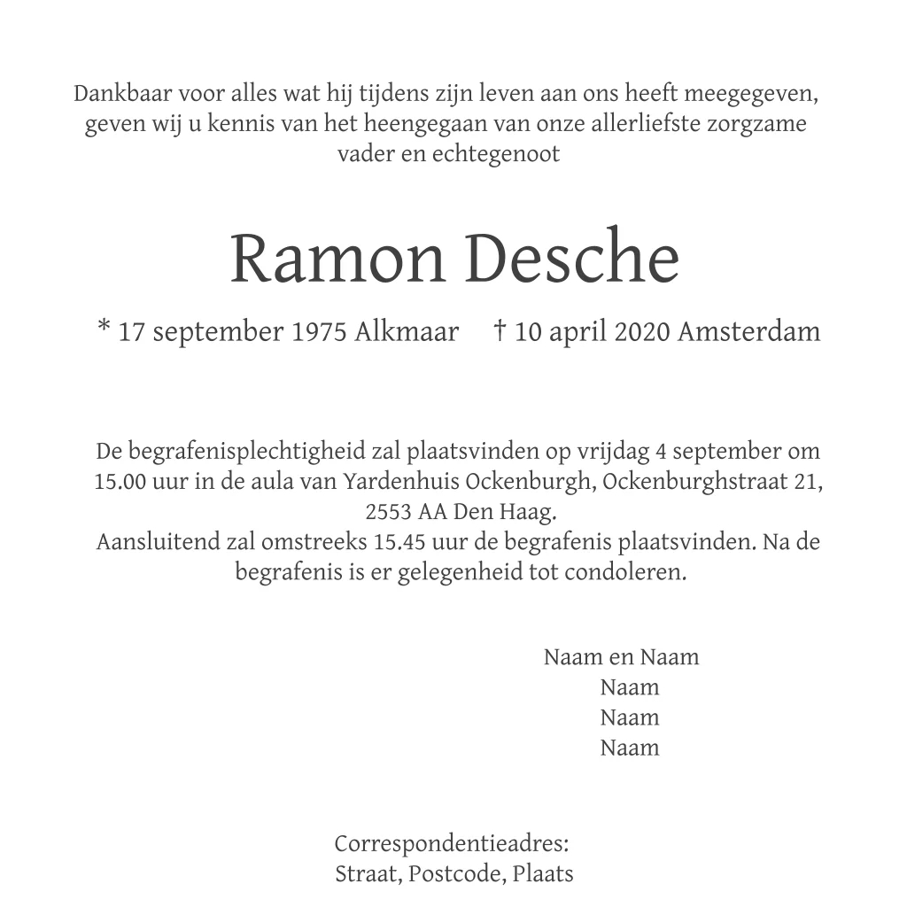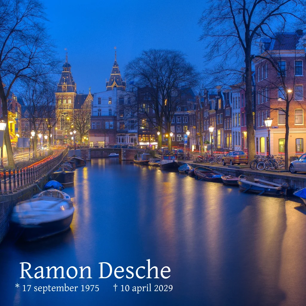 Rouwkaart Amsterdam met foto grachten. U kunt de lettertypes aanpassen en ook de foto eventueel vervangen (9999).
