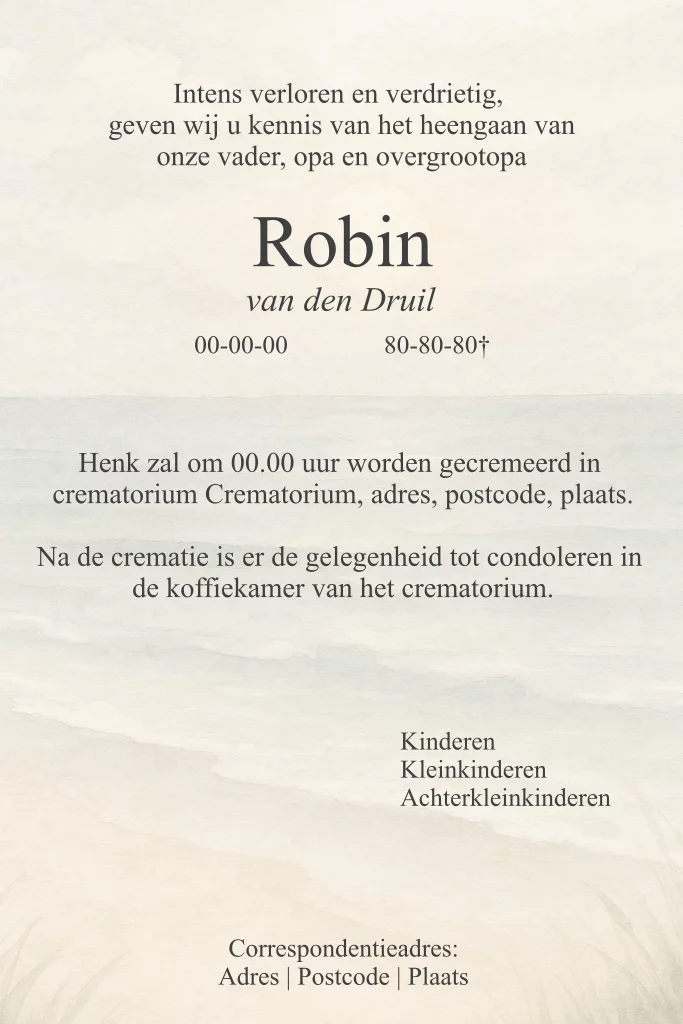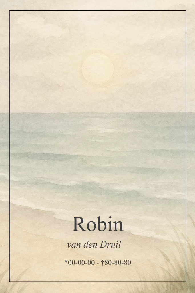 Rouwkaart met een afbeelding in waterverf stijl van de zon, zee, strand en duinen. (555555)