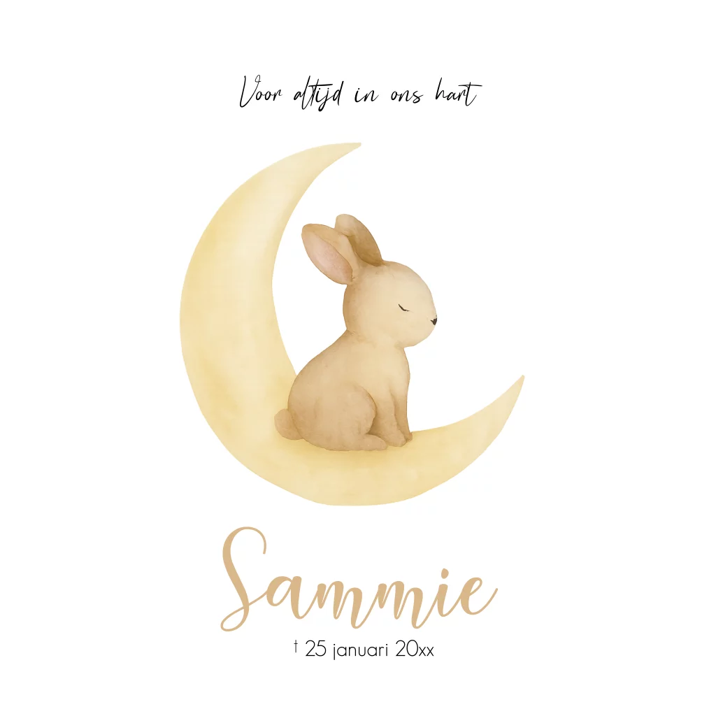Rouwkaart voor een jongen of een meisje met een konijn op de maan. In warme aardetinten. (999999)