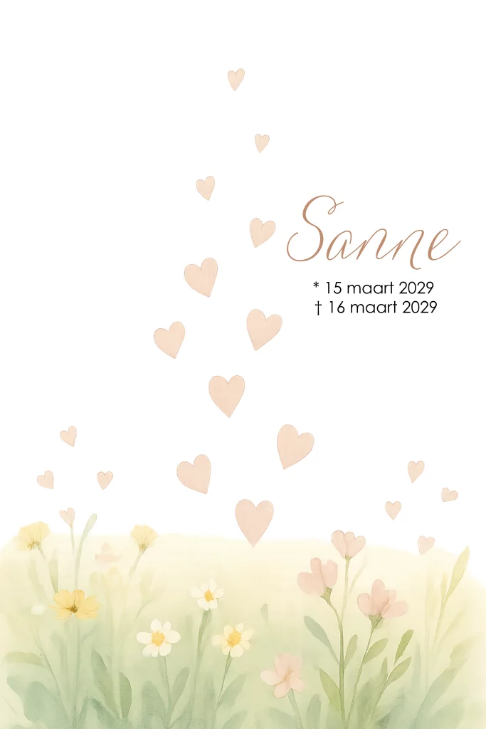 Rouwkaartje voor een kindje een baby meisje bloemenveld in pastel kleuren. Een vlinder en paardenbloem pluisjes. (999999)