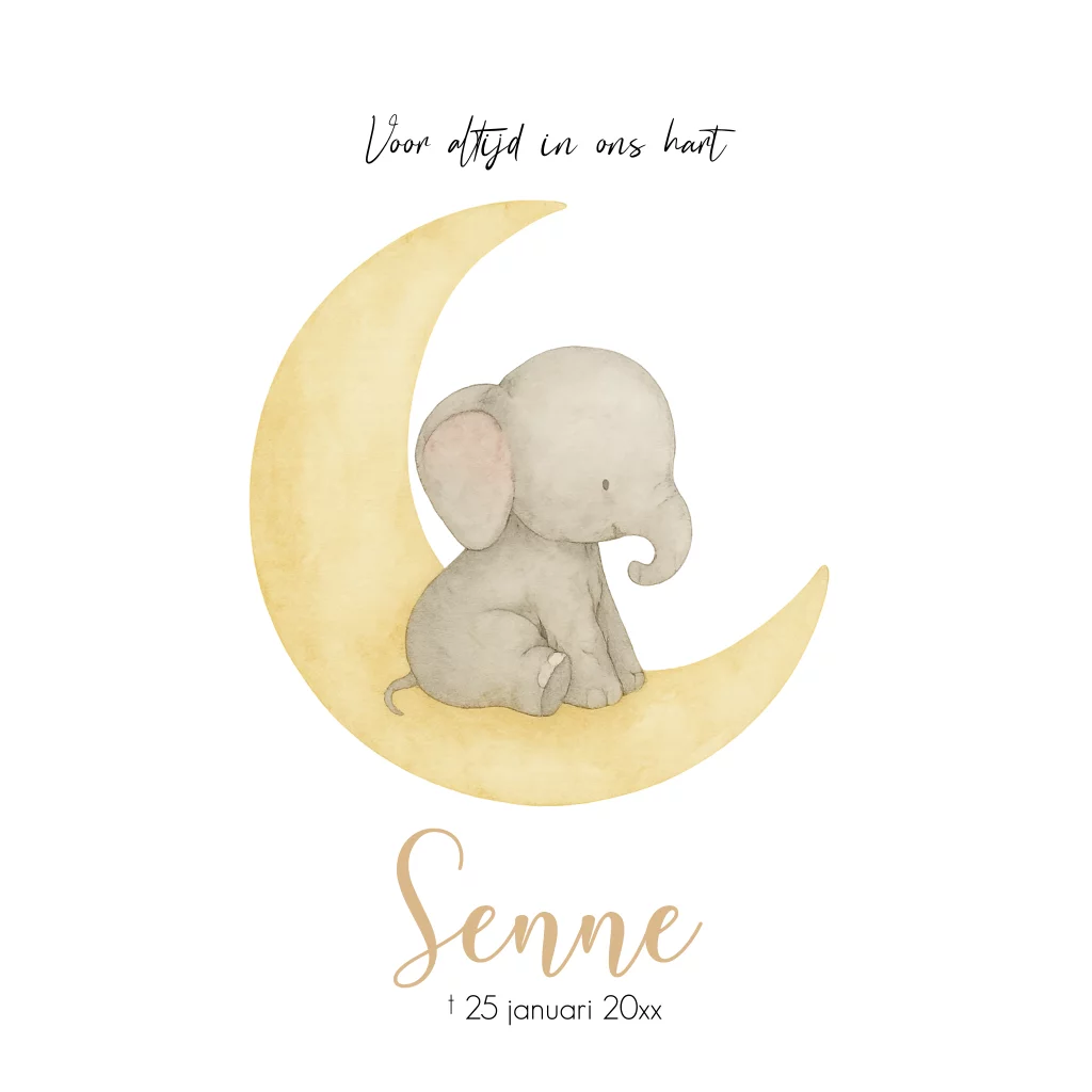 Rouwkaart voor een jongen of een meisje met een olifant op de maan. In warme aardetinten. (999999)