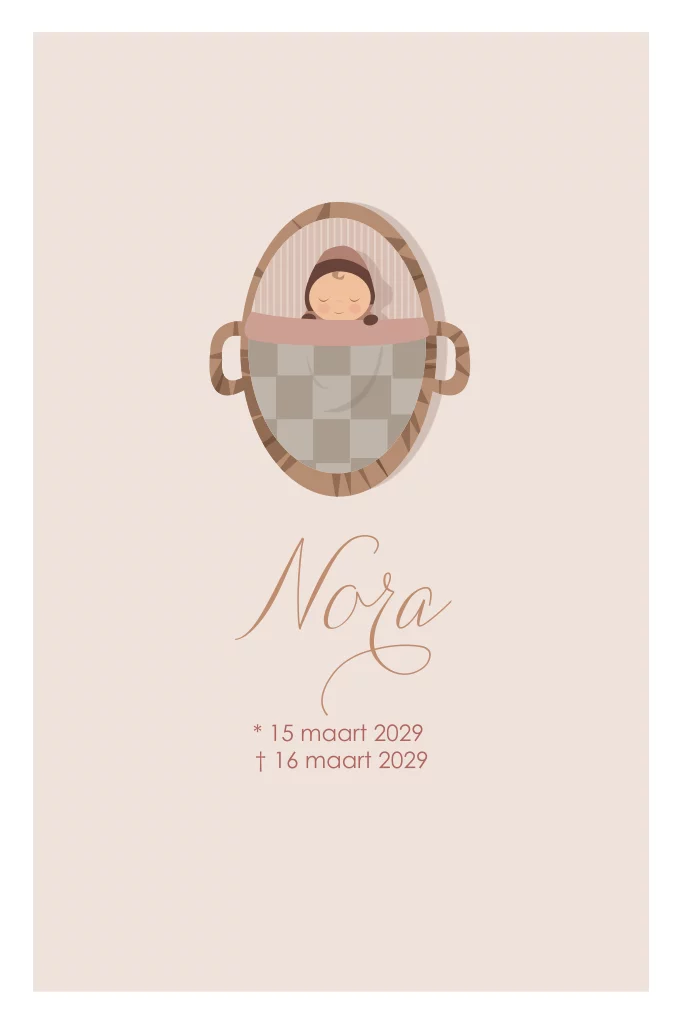 Rouwkaartje voor een kindje een baby meisje met een afbeelding van een kindje in een mandje/wiegje. (1278)